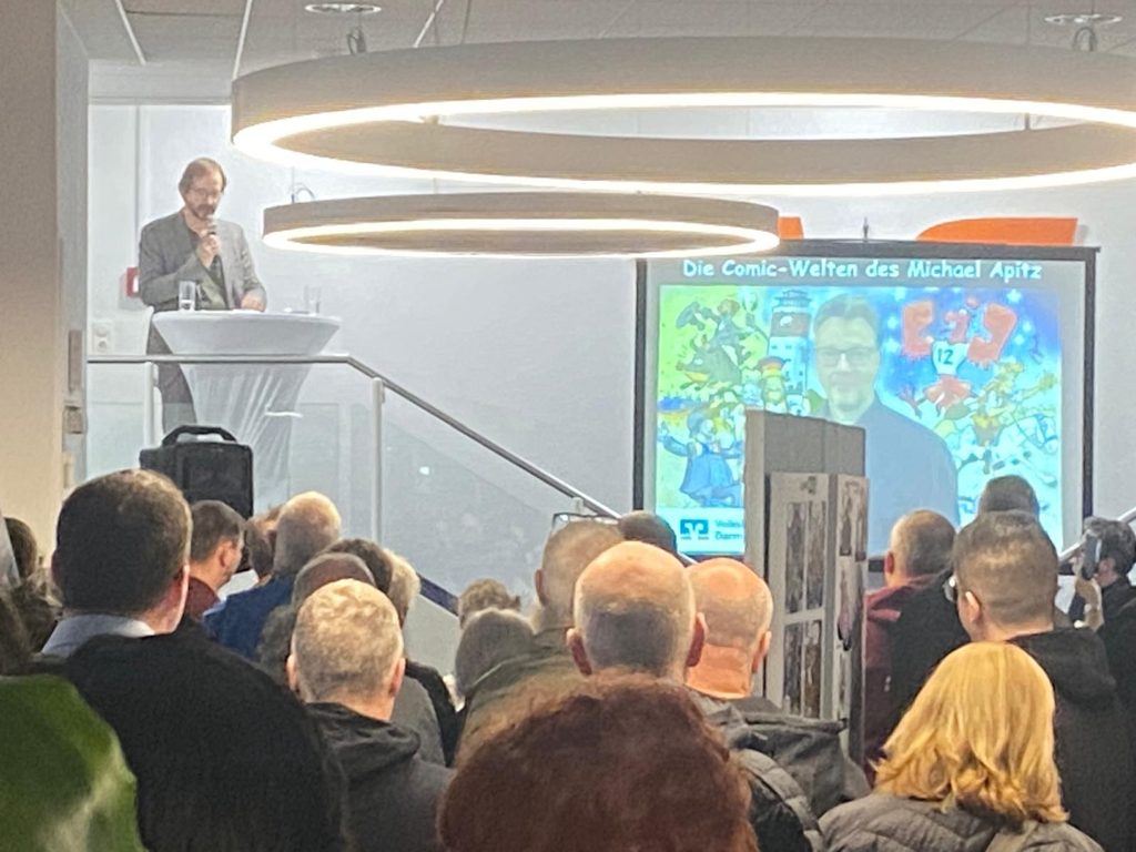 Wie viele von Euch wissen, haben Michael Apitz und ich vor ein paar Jahren eine Gesamtausgabe von Karl – der Spätlesereiter veröffentlicht. Ende der 1980er Jahre hatten Michael sowie Patrick und Eberhard Kunkel die Idee zu dem „deutschen Asterix“, der auch heute noch eine große Fangemeinde hat. Aber Michael hat über die Jahre natürlich noch viel mehr Comics gemacht. Eine Ausstellung in der Volksbank in Groß-Gerau zeigt jetzt einen Ausschnitt davon. Und zur Ausstellungseröffnung durfte ich die Laudatio halten. Hier könnt Ihr sie in Teilen nachlesen: Die Comic-Welten des Michael Apitz.