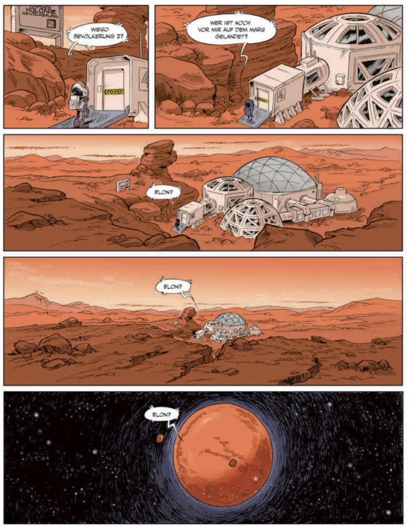 (Bernd Kissel) Die Känguru-Comics entwickelten ja schnell ein Eigenleben. Basierte das Universum anfangs noch ausschließlich auf den Figuren der Känguru-Chroniken, kamen mit der Zeit neue Charaktere und Handlungsstränge hinzu. So auch die fiktive Sitcom Elon & Jeff on Mars. Was als Gag eines einzigen Strips begann, entwickelte sich schnell zu einer bei uns Machern und beim Publikum beliebten unregelmäßigen Reihe innerhalb der Serie. Marc-Uwe und ich hatten viel Spaß mit den Figuren und den Möglichkeiten, die diese Intermezzi auf dem Mars boten. Als wir uns dann nach über 600 Folgen dazu entschlossen hatten, die Känguru-Comics auf unbestimmte Zeit zu pausieren, war gleich klar, dass wir gerne weiter miteinander Comics machen wollten. Und schnell war auch das passende Thema gefunden: ein Album von Elon & Jeff on Mars, in dem wir ihre Vorgeschichte und ihr Schicksal genau unter die Lupe nehmen wollten.