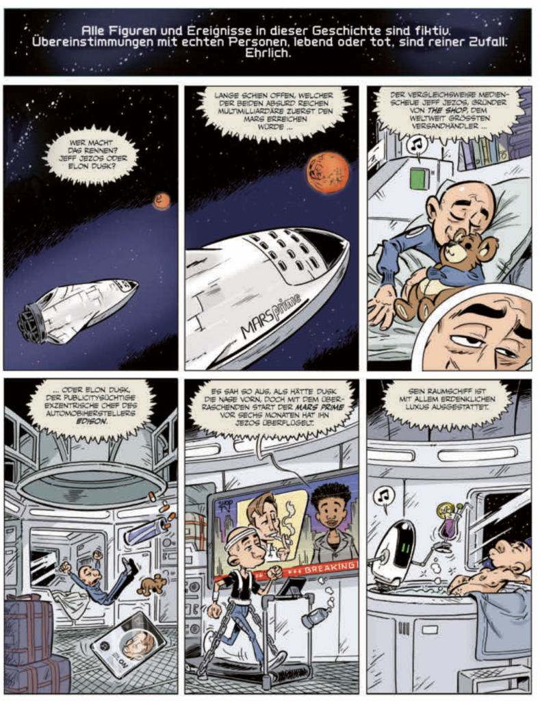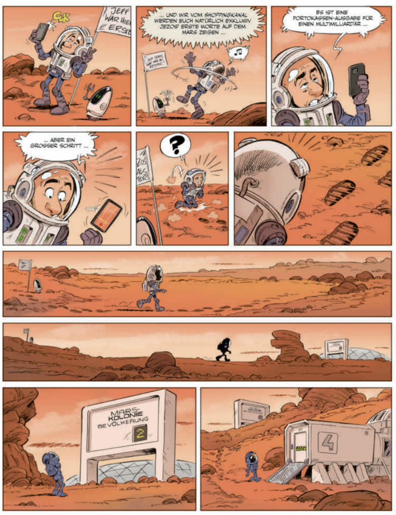 Als treue Leser der Comic-Denkblase kennt Ihr natürlich Bernd Kissel. Der sympathische Saarländer und fantastische Zeichner ist seit langem Freund dieses Blogs – wie Ihr wisst, hat er das Titelbild gestaltet, und war auch schon öfter Thema hier auf der Seite. Da ist es doch logisch, dass ich das neue Jahr mit einem Comic beginne, der aus seiner Feder stammt. Elon & Jeff on Mars – eine weitere Zusammenarbeit von Bernd mit Marc-Uwe Kling. Wer die Känguru-Comics mag, wird auch die aktuelle Geschichte lieben. Wie schön, dass Bernd als erste Amtshandlung des Jahres meine Fragen beantwortet hat. Lest also mehr zum aktuellen Comic: Elon & Jeff on Mars.