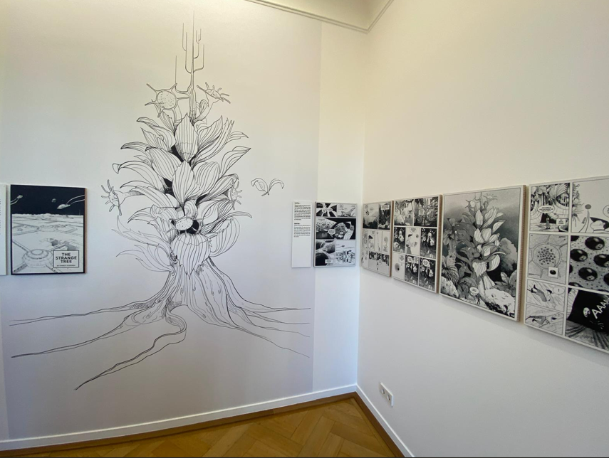 Da ist etwa die Arbeit „The strange tree“ von Charity Akunda. Eine Mixed-Media Künstlerin aus Uganda, die die ersten zehn Seiten einer noch nicht veröffentlichten Geschichte zeigt. In ihrer Dystopie vermengt sie Umweltthemen mit dem Thema Kolonialismus. Ihre Protagonistin reist von einer Mondsiedlung zur unbewohnbaren Erde, um den Zustand der Pflanzenwelt zu erforschen. Während ihrer Arbeit entdeckt sie einen beeindruckenden, alten Baum. Im Museum wird die Zeichnung wandfüllend gezeigt und man kann die unfertige Geschichte lesen.