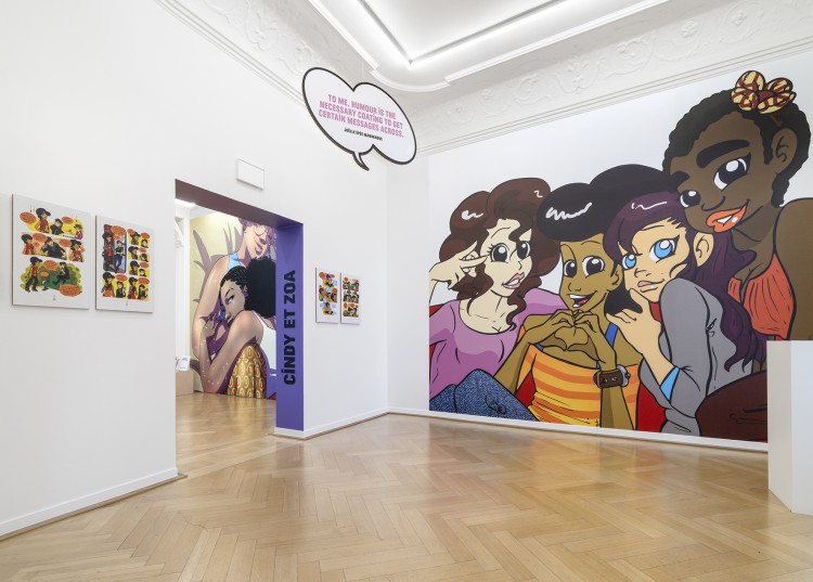 In einem anderen Raum wartet die Arbeit von Reine Dibussi. Die schwarze Feministin zeigt ihren Comic Cindy & Zoa. Die als Online-Comic entwickelte Geschichte erzählt die Liebesgeschichte zweier Frauen in der fiktiven Stadt Njinga in Zentralafrika. Bei der Pressekonferenz zur Ausstellungseröffnung weist die Zeichnerin daraufhin: Homosexualität ist in Kamerun strafbar. Mit ihrem Comic engagiert sie sich für Afro-Queerness – will einen Raum schaffen für Unterstützung und den Widerstand der Community.