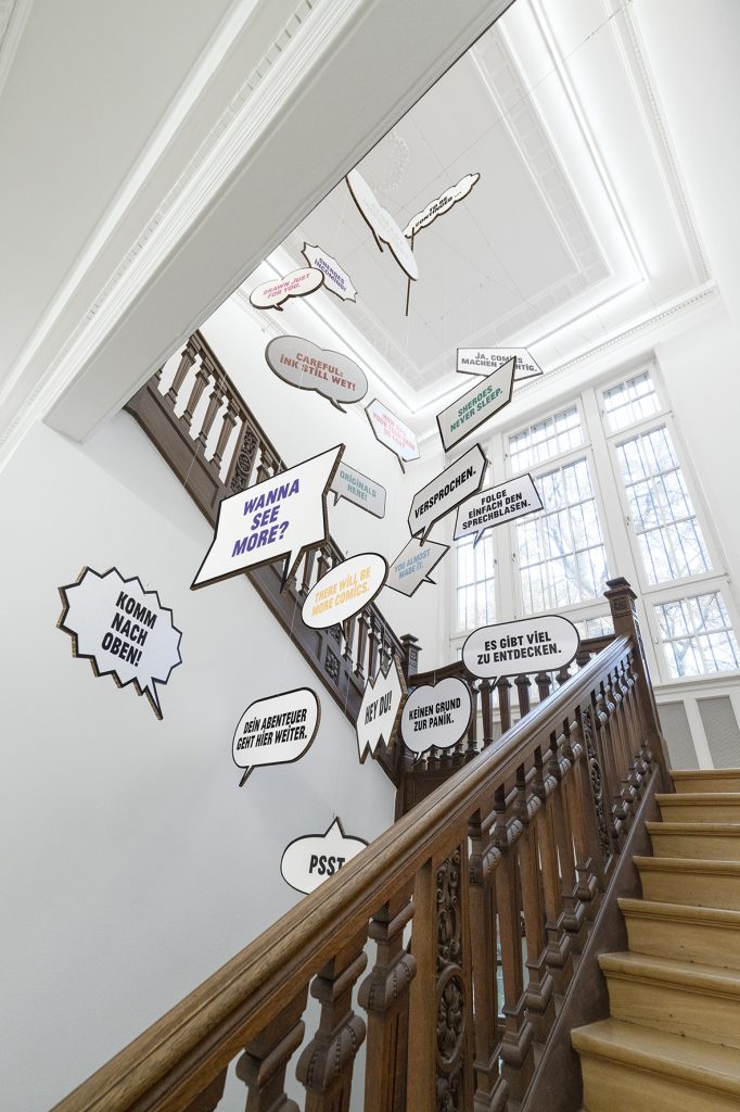 Im Treppenhaus der Museumsvilla hängen Sprechblasen von der Decke. Im Foyer warten die unterschiedlichsten Comicfiguren als Pappkameraden auf die Gäste. Und wer weiter in die Ausstellungsräume geht, wird von reproduzierten Comicseiten und wandfüllenden Bildtapeten empfangen. Pro Raum werden meist Arbeiten von zwei Künstler:innen gezeigt. Und es wird schon gleich zu Beginn klar: Die Ausstellung beeindruckt durch ihre Heterogenität.